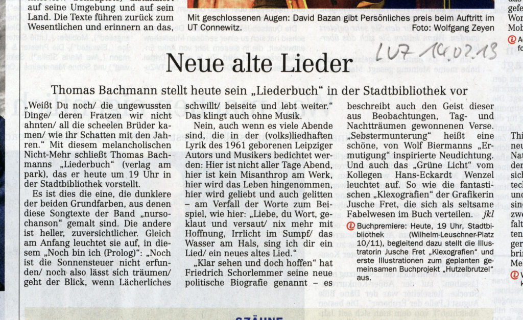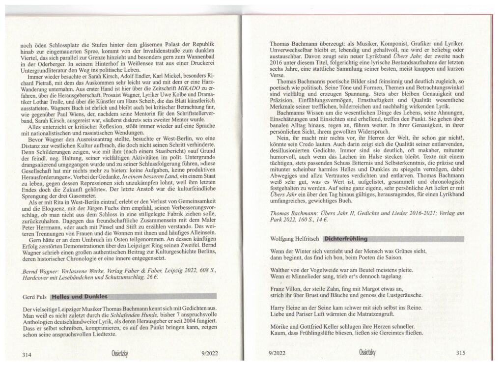 Dass Thomas Bachmann vielseitig ist, ein politischer Autor und ein Multitalent, hat er schon häufig bewiesen. Die Liste ist lang, als Musiker, engagierter Liedermacher und Förderer junger Talente ist er hervorgetreten, sogar als Zeichner, vor allem aber als fein beobachtender Lyriker, als Erzähler und Herausgeber. So erscheint die von ihm im Verlag am Park herausgegebene Reihe politischer Lyrik „Schlafende Hunde“ seit nunmehr über 12 Jahren. In diesem Jahr gab es den achten, wie immer abwechslungs- und umfangreichen Band, wobei es dem Berliner Verlag zur Ehre gereicht, das „Stief- und Kellerkind Lyrik“ so unermüdlich wie unerschrocken in schöner Regelmäßigkeit zu „füttern“ und zu fördern.